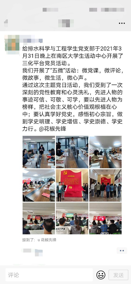 奋斗百年路,启航新征程。通过此次“三化”平台活动和“五微“内容的开展,给排水科学与工程学生党支部全体党员对党史、党章、党的精神有了更深入的了解。用党的奋斗历程和伟大成就鼓舞斗志、明确方向,用党的光荣传统和优良作风坚定信念、凝聚力量,用党的实践创造和历史经验启迪智慧、砥砺品格。以更加昂扬姿态奋力开启全面建设社会主义现代化国家新征程,以优异成绩迎接建党一百周年。