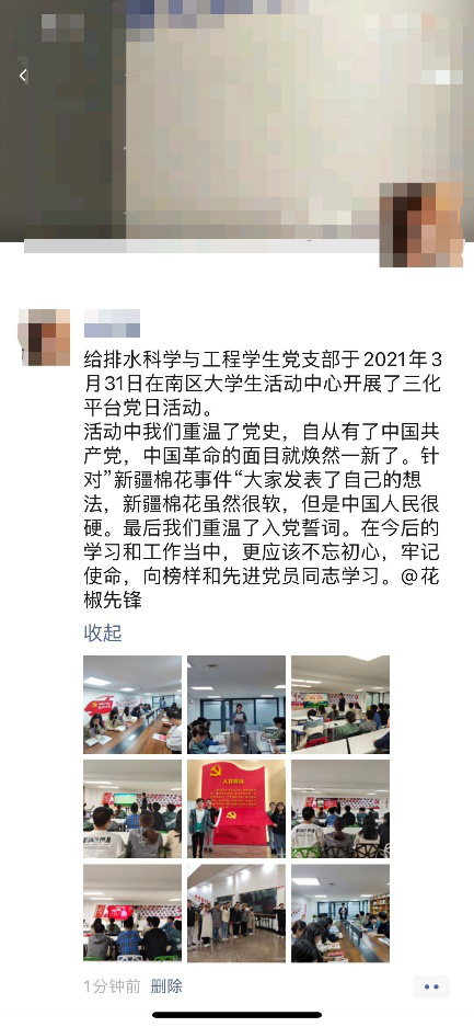 活动结束后,支部每名党员通过微信等新媒体平台,用文字、图片等多种形式,讲述自己的故事,发表自己通过“三化“平台活动的心得和收获。