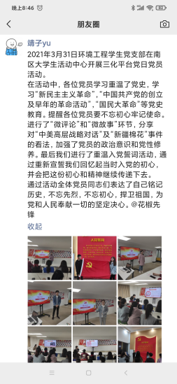 2021年3月31日,环境工程学生党支部在三化平台开展一次以“学党史、悟思想、担使命”主题党日活动,活动内容主要包括:开展一次以“学党史、悟思想、担使命”为主题的党课、针对时事热点发表评论和感想、微故事分享,讲述身边优秀党员的考研故事、重温入党誓词等。活动期间大家踊跃发言,分享自己学习党史的心得感想。牢记初心与使命,加强党史教育,加强党性修养。