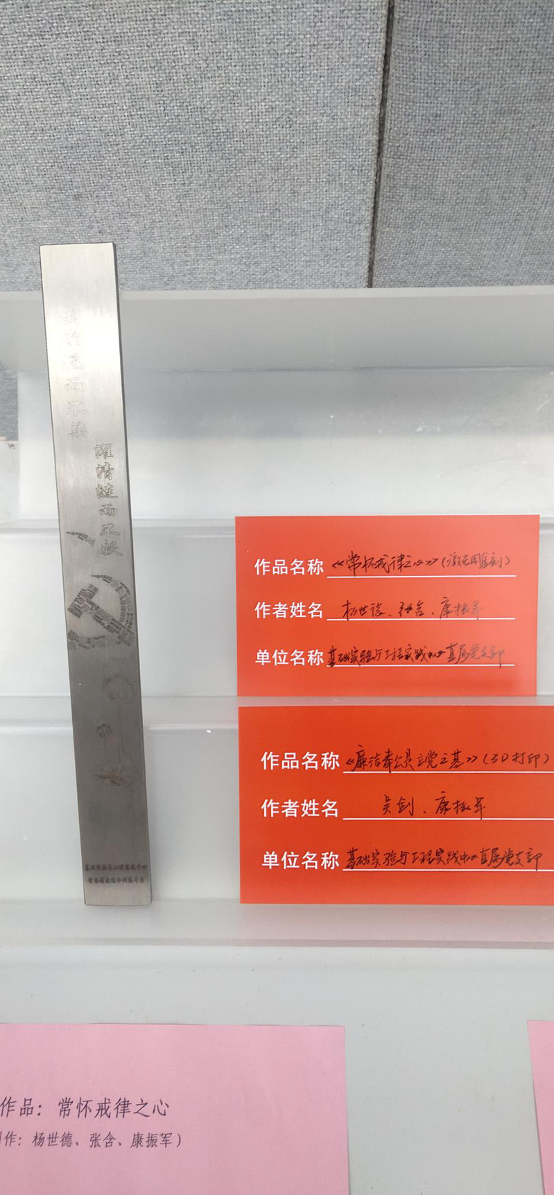 通过此次的参观,让我对于身为一名党员应该保持清正廉洁的作风有了更加深刻的认知。廉洁文化是党内政治文化和社会主义先进文化的重要组成部分,在党风廉政建设和反腐败斗争中处于基础性地位。在此次廉洁文化作品展览中,让我印象最为深刻的是一个名为《常怀戒律之心》的作品,这个作品是以党规党纪组合设计的党徽和莲花用激光工艺雕刻于戒尺上。在古代,学堂里的夫子常常手里会拿着戒尺。其实对于我们党员来说,每位党员的心中都应当拥有一把戒尺,时刻约束自己。常修从政之德,常怀律己之心,常思贪欲之害,常戒非分之想。