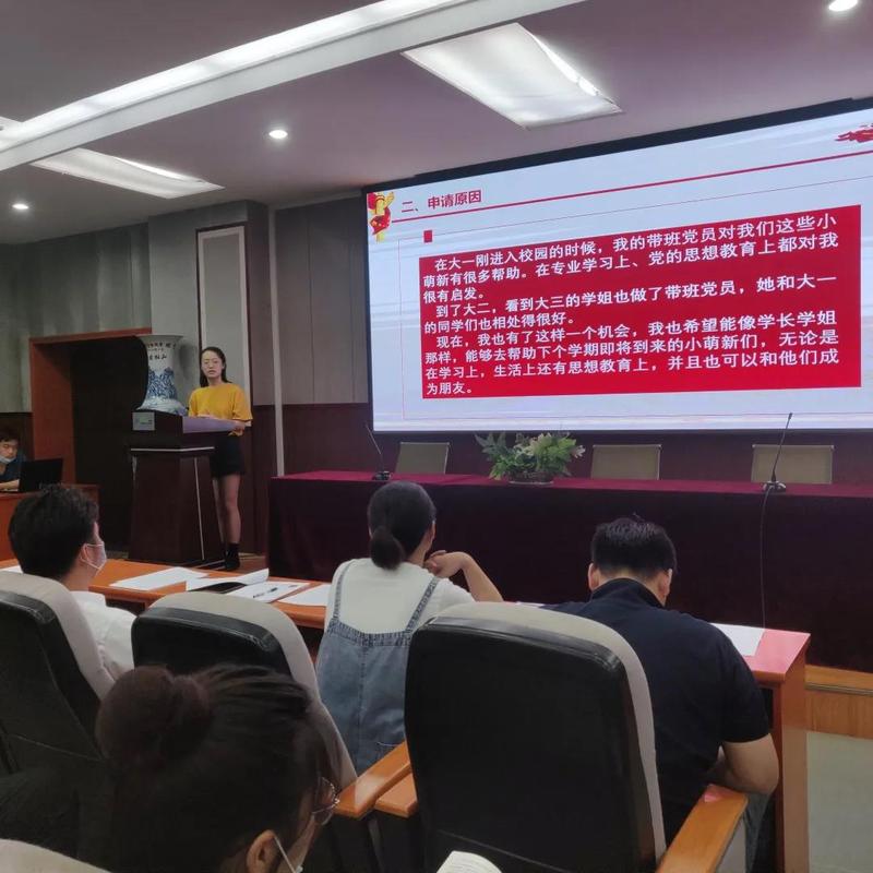 活动伊始,万雯怡老师宣布本次招新面试正式开始。本次面试分为线上面试和线下面试。面试环节中,21位学生党员从自身经历谈起,阐述着大学以来所经历的各种丰富多彩的人生经历,回想着初入校园时带班党员给予自己的帮助与鼓励,讲述了自己对带班党员这一身份的理解。党员们各抒己见,在面试中不约而同地谈起自己对带班党员这一岗位由衷地向往,并且都发表了如果当上带班党员后怎样肩负起应有的责任与担当。评委老师们围绕党员的自述以及平时表现,提出了富有针对性的问题,充分考验了同学们的心理素质、人际交往和应变能力,现场气氛活跃,同时也让评委老师对大家的认识更深了一步。