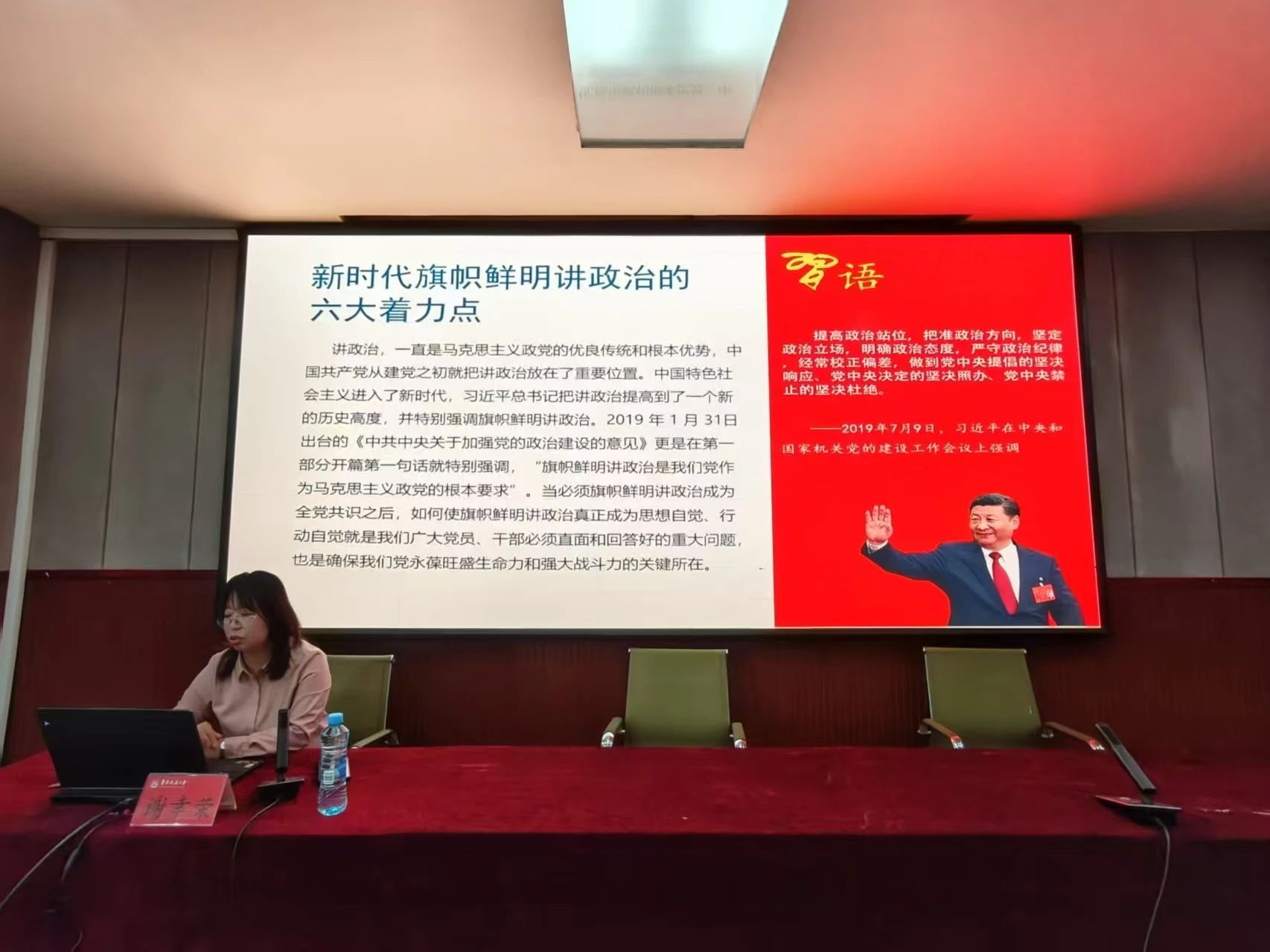 紧接着,谢幸荣引用习近平总书记在十九大报告中的重要讲话,强调了一名合格的共产党员要不断提高政治觉悟和政治能力,并为学员们指明了提高政治能力的途径:要牢固树立政治理想,正确把握政治方向,坚定站稳政治立场,严格遵守政治纪律,加强政治历练,积累政治经验,自觉把讲政治贯穿于党性锻炼全过程。