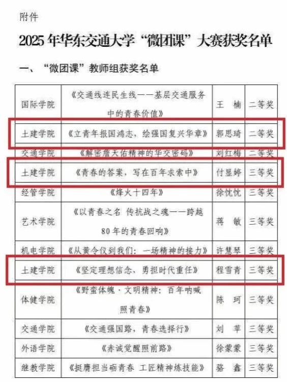 近日,学校公布2025年“微团课”大赛结果,我院参赛师生凭借扎实的理论功底、生动的课程设计和昂扬的青春风采,斩获一等奖1项、二等奖1项、三等奖3项。学院团委获“优秀组织奖”,万雯怡获“优秀指导教师”。充分展现了学院在大学生思政教育和团员青年思想引领等工作的成效。