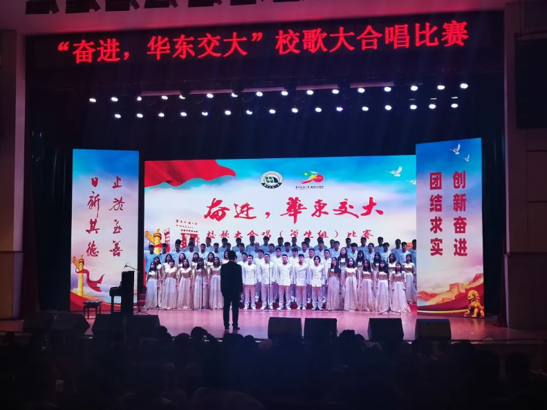 合唱团成员身穿整洁大方的服装,自信满满,以饱满的精神状态给评委和观众们带来了歌曲《奋进,华东交大》。他们声音雄厚,气势磅礴。歌词的字里行间体现了我校“日新其德,止于至善”的校训,以及将学生培养成“团结、求实、创新、奋进”人才的初心。
