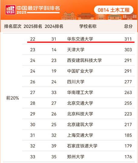 10月15日,著名高等教育评价机构——上海软科正式发布“2025软科中国最好学科排名”,全国共有167所设点高校参与土木工程学科排名,本次公布排名前50%高校(共计83所)。