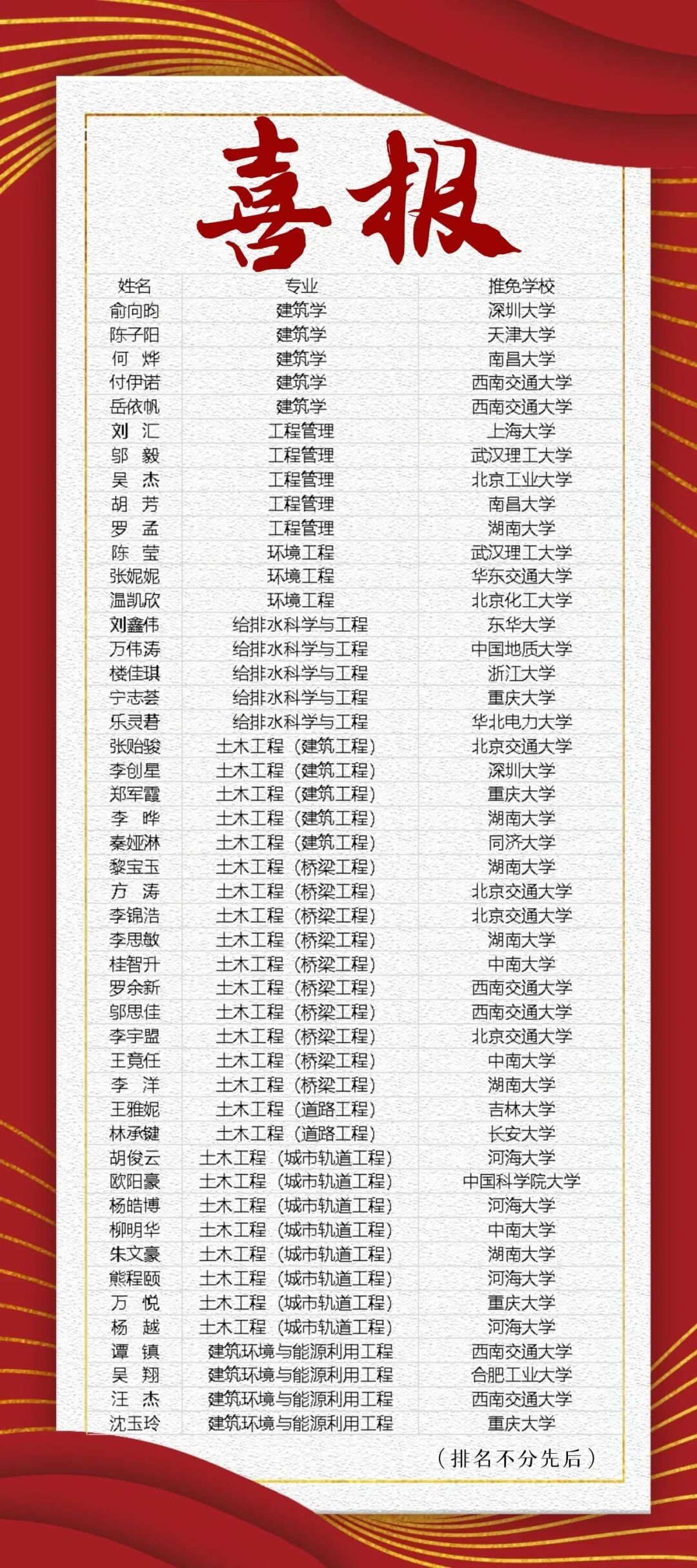 金秋时节,硕果盈枝!yl7703永利集团2026届本科生推荐免试攻读硕士研究生工作再传捷报,共有47名优秀学子成功获得推免资格,录取结果喜人。在此,谨向所有顺利保研的同学表示最热烈的祝贺!并向辛勤培育的全体老师致以最诚挚的感谢!