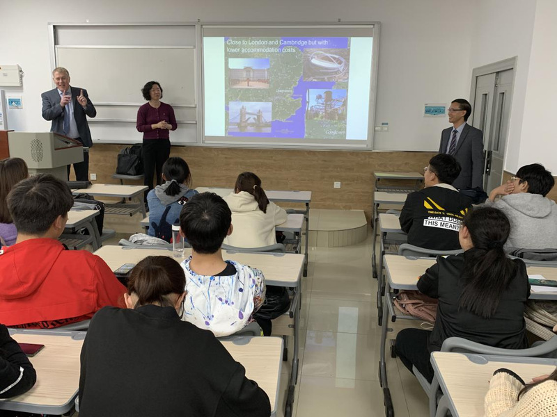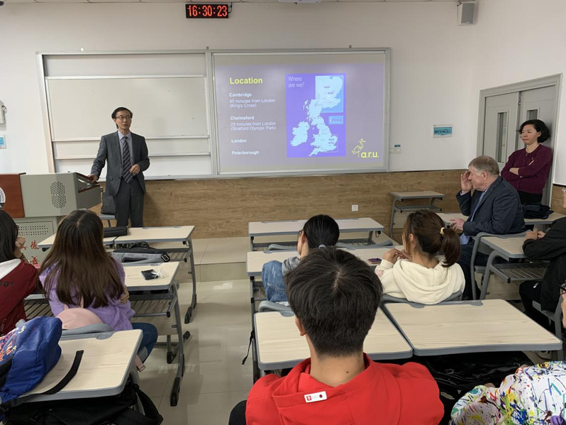 之后,蔡方方博士一行到南区25栋教学楼与我校2019级工程管理专业(中英合作办学)新生见面。蔡院长首先对工程管理大一学生表示问候,之后介绍了ARU的地理位置、学校历史、我校学生在ARU的学习情况等,并播放了在ARU就读的我校2016级工程管理专业学长学姐对2019级学生的学习建议视频。