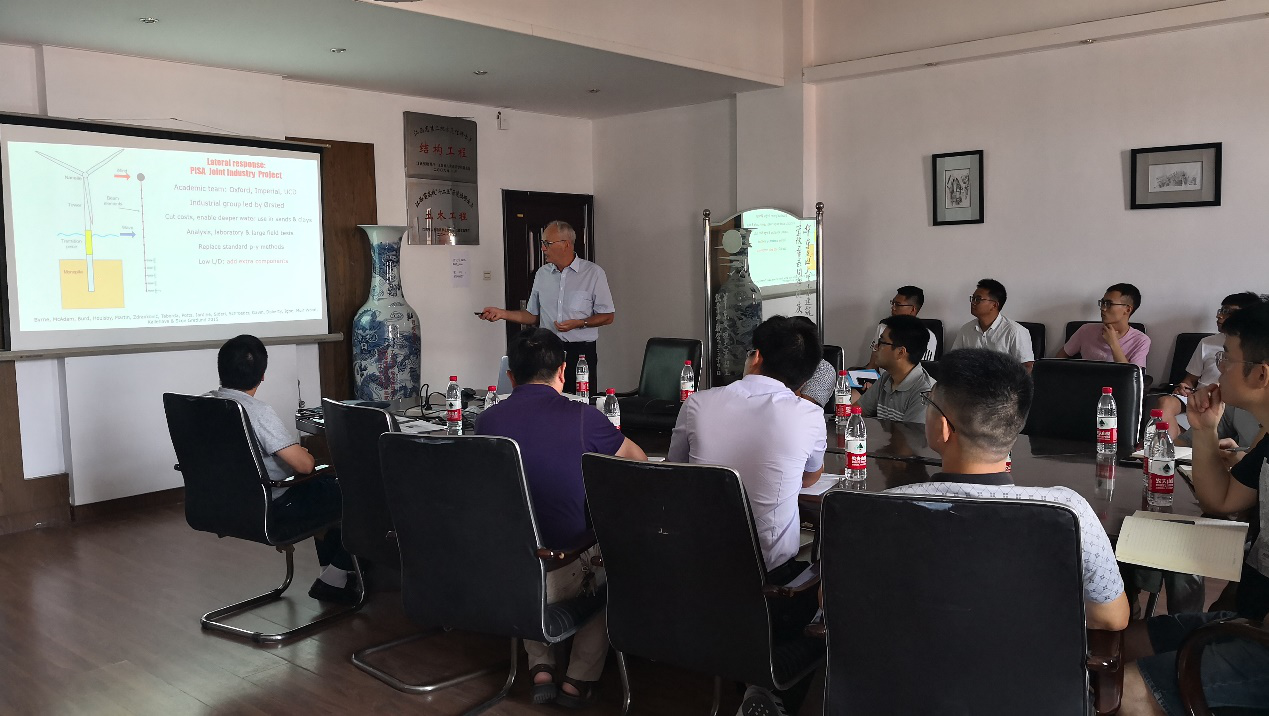Jardine教授作了题为“The Behaviour of Piles Driven in Weak Calcareous Chalk, with Particular Reference to Offshore Wind-turbine Foundations”的精彩学术报告。报告回顾了砂土、粘土中打入桩的特性和承载力分析方法以及软弱钙质石灰岩中海上风电打入桩基的承载力关键问题,根据2个海上风电和陆地软弱钙质石灰岩打入桩基的大型原位试验和测试分析,结合PISA项目研究成果,提出了软弱钙质石灰岩打入桩的Chalk ICP-18轴向承载力计算方法、水平荷载和循环荷载特性,并介绍了目前正在进行的重大工程ALPACA项目及其国际合作进展情况。Jardine教授的讲座内容丰富、深入浅出,并与参加讲座的老师和学生进行了深入的讨论和交流。