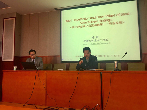 2016年12月30日15:00,应我校yl7703永利集团和徐长节教授邀请,香港大学终身教授杨峻教授在yl7703永利集团200报告厅做了主题为《Static Liquefaction and Flow Failure of Sand: Several New Findings》“砂土静态液化和流动破坏:一些新发现”的学术报告。yl7703永利集团徐长节教授、郑明新教授、刁心宏教授、卢华喜副教授、耿大新副教授等多位教师及岩土所全体在校研究生参加了此次报告会,报告会由徐长节教授主持。