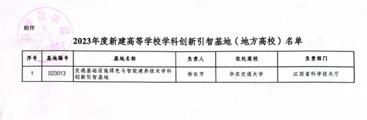 近日,国家科技部、教育部联合发文,由我校校长徐长节教授担任负责人申报的“交通基础设施绿色与智能建养技术学科创新引智基地”成功入选2023年度“高等学校学科创新引智计划”(简称“111计划”)。该基地是我校首个国家级学科创新引智平台,也是我院依托“土木基础设施智慧建维研究院”获批省发改委 “江西省土木基础设施智慧建维工程研究中心”和全职引进欧盟科学院院士/国家级人才王翔宇教授以来的新突破,是我院多年学科建设的重大突破。