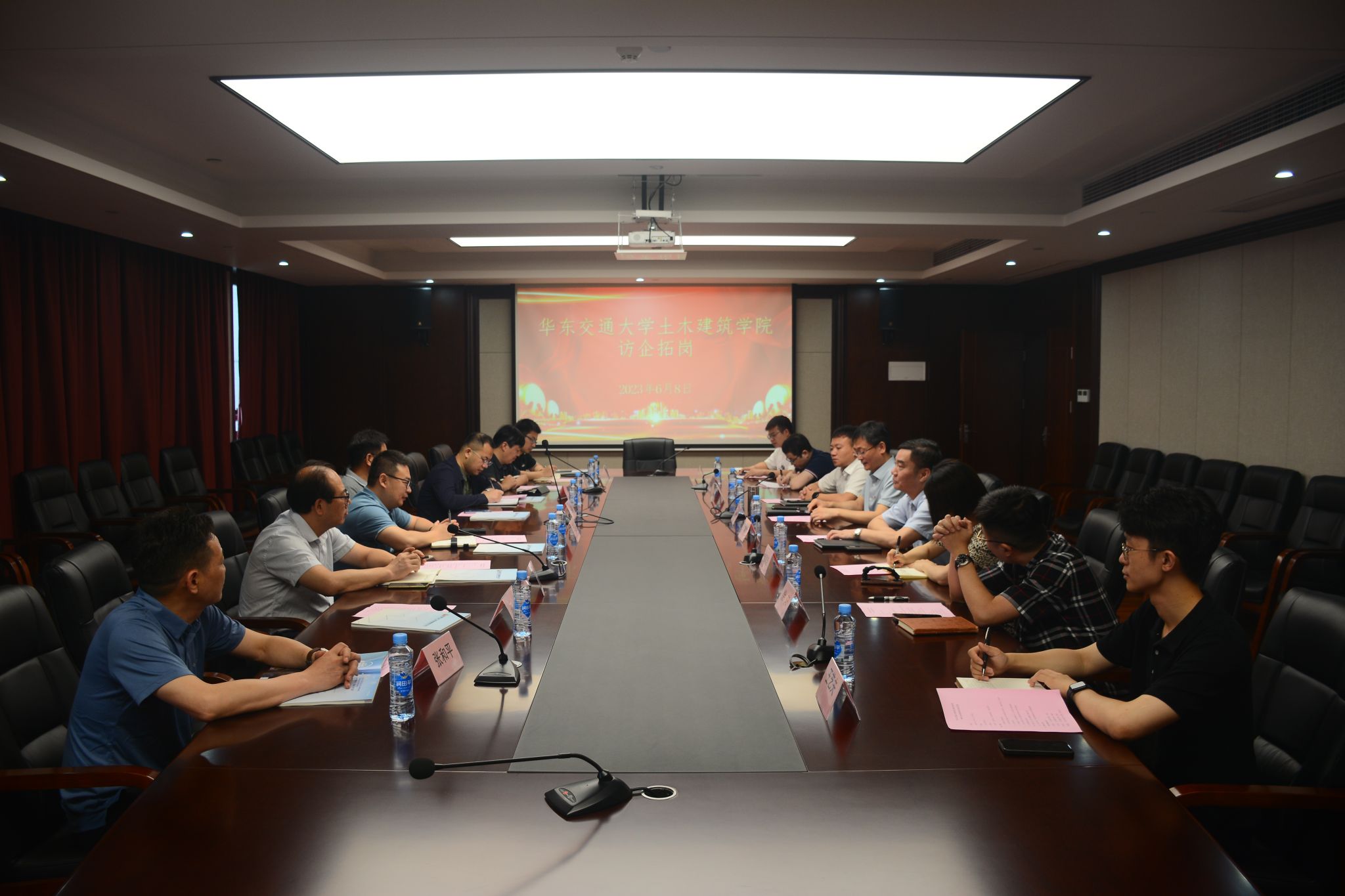 6月8日,土建学院院长庄海洋率队赴江西建工第二建筑有限责任公司(以下简称“江西建工二建”)走访交流。江西建工二建党委副书记、总经理丁国老出席座谈会。江西建工二建党委委员、副总经理文蔚平、人力资源部部长陈铭、人力资源部副部长储珑佳、在江西建工二建工作的部分校友代表(项目管理公司经理傅昆(2008级土木工程(建工))、项目管理公司副经理徐阳(2008级土木工程(建工))、省外分公司副经理王荣昌(2008级工程管理)、核算结算部核算员杨鹏(2016级土木工程(建工))、法务部法务专员王艺夫(2018届法学硕士)),校人事处副处长蔡智超、土建学院副书记郑轶、副院长方焘、张季、王永祥教授、张和平教授、刘强博士陪同座谈交流。