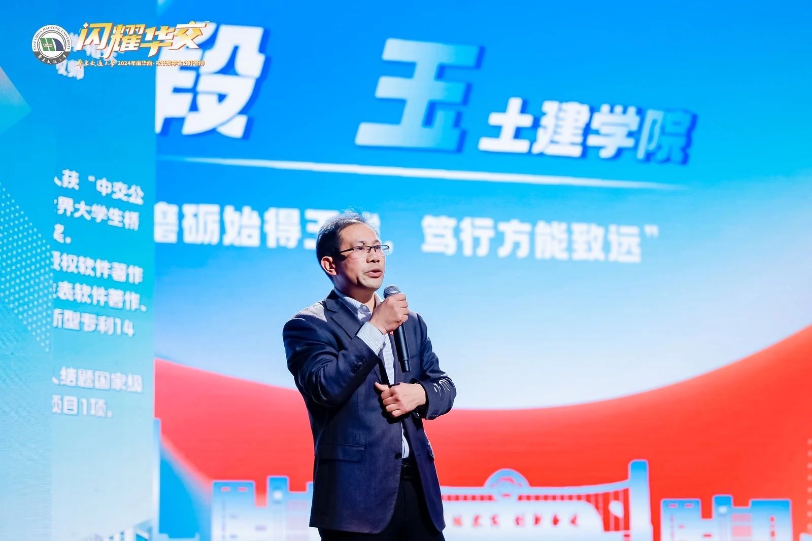 喜讯如雷,激荡人心!2024年12月6日,“南华西•闪耀华交”校长奖学金公开答辩在南区礼堂圆满落幕,我院土木(桥梁茅以升)2021-1班段玉同学获校长奖学金,工管2021-2班余佳欣同学获校长奖学金提名奖。