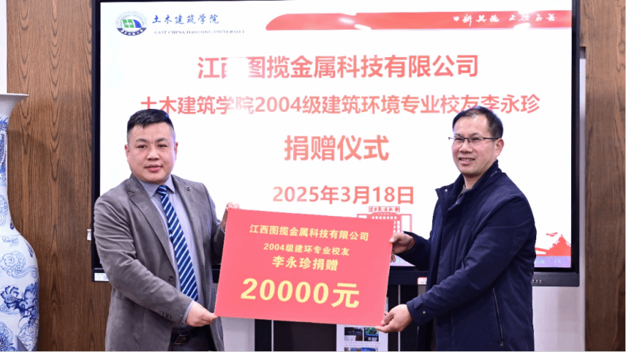 3月18日下午,土建学院在教9栋302会议室举行校友捐赠仪式,江西图揽金属科技有限公司总经理李永珍(我院2004级建环专业校友)、综合部经理宋利娟、销售部经理邓梦云,学院党委书记刘永胜,学校校友办公室副主任、对外联络处副处长吴亮秦,学院能源与人工环境系主任康慧伦、学工办主任兼团委书记万雯怡、学工办副主任、团委副书记、校友联络负责人华罗娟、兼职团委副书记严安迪出席仪式,仪式由学院党委副书记郑轶主持。