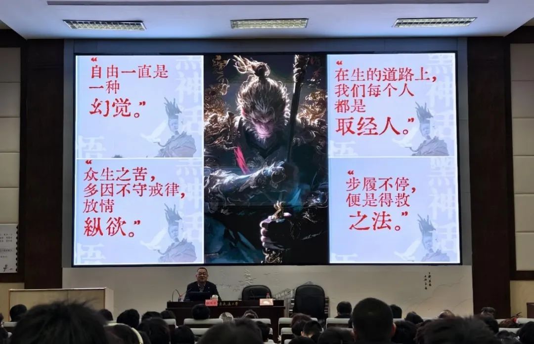 讲座中,姚鸿梁还以现象级游戏《黑神话:悟空》中的哲理金句为引,阐释自律与自由的关系。“自由一直是一种幻觉。”“众生之苦,多因不守戒律,放情欲纵。”他强调,面对学业与职业压力,学生需以“取经人”的姿态步履不停,在挑战中实现自我超越。