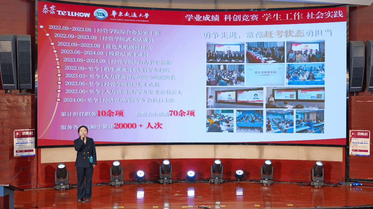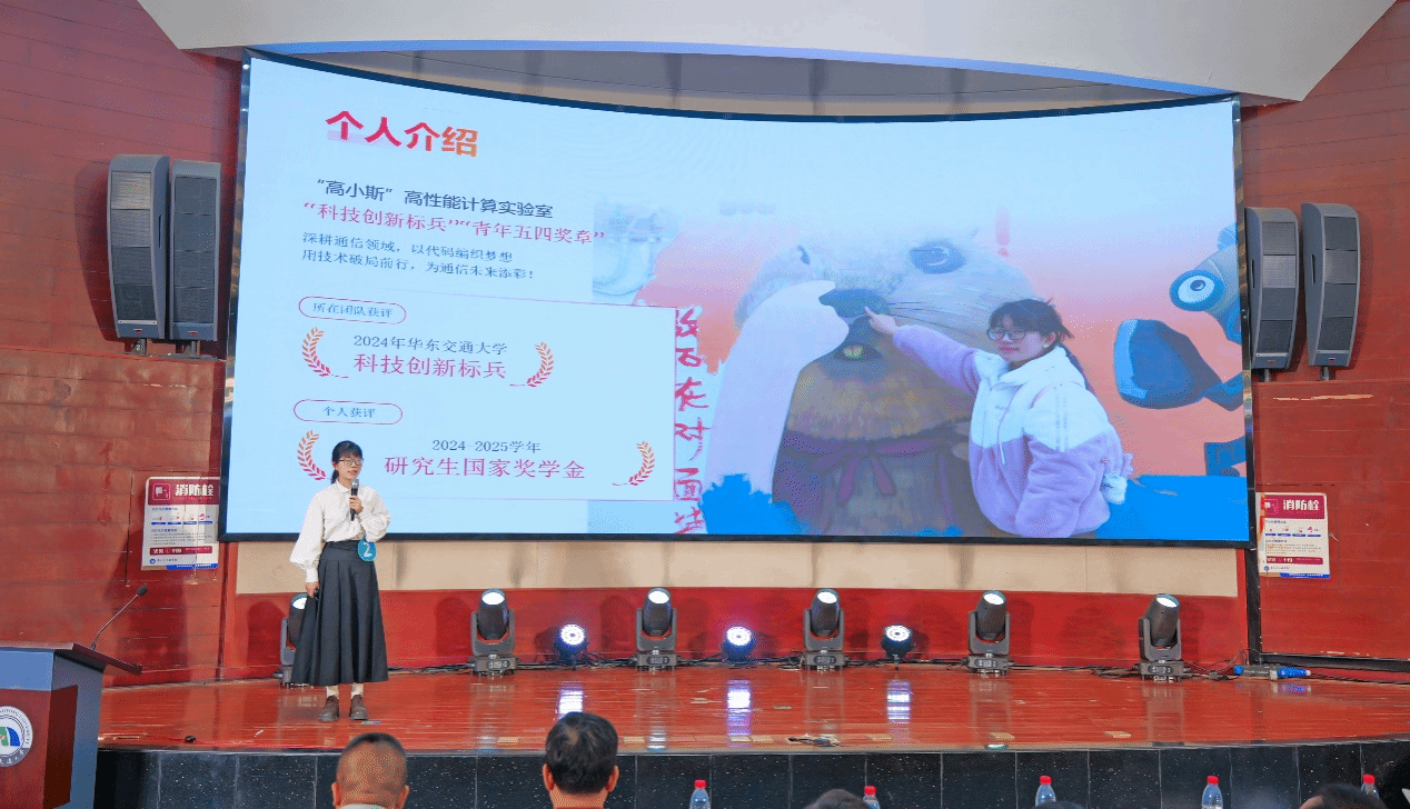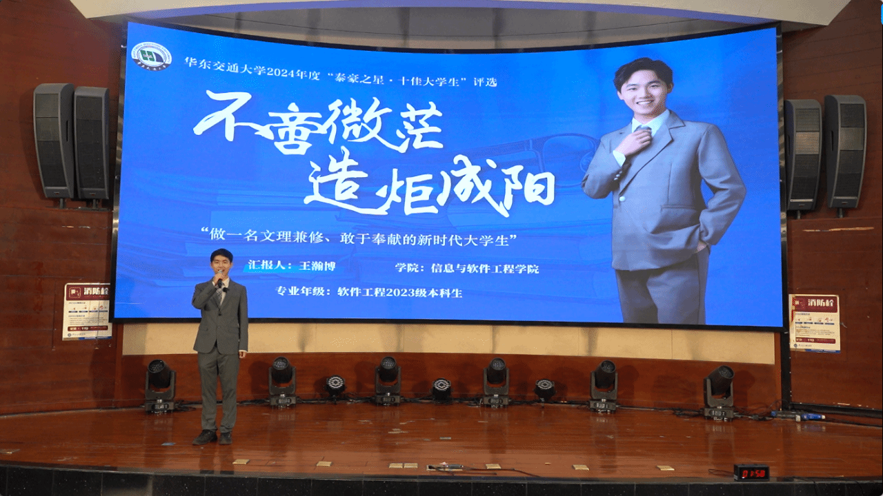 星河璀璨,青春当燃。本次评选分为研究生组和本科生组,21位候选人按照抽签顺序依次上台,通过视频展示、风采展示、选题作答三个环节依次进行个人展示。他们中有学术科研的佼佼者,有志愿服务的践行者,有创新创业的开拓者,也有艺术体育的追梦者。他们的精彩表现是华交学子弘扬“火车头”精神、争做“新铁军”的充分展示,赢得了阵阵掌声。