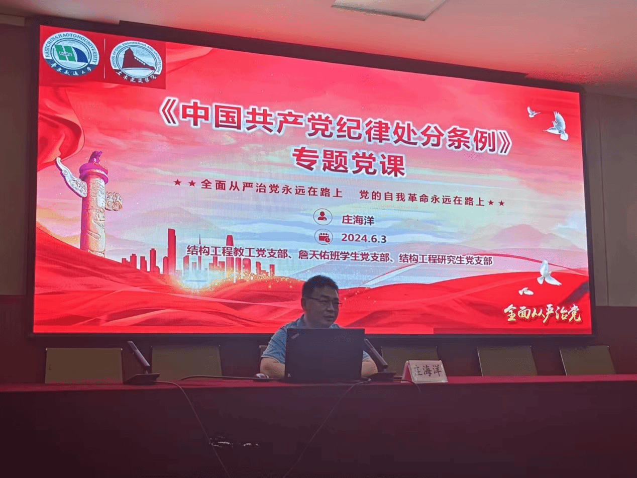 为深入学习贯彻习近平总书记关于全面加强党的纪律建设重要论述,把纪律建设摆在更加突出的位置,促进党员干部真正把学纪明纪知纪守纪内化于心、外化于行。yl7703永利集团院长庄海洋为结构工程教工党支部、詹天佑班学生党支部和结构工程研究生党支部全体党员讲授《中国共产党纪律处分条例》的专题党课。