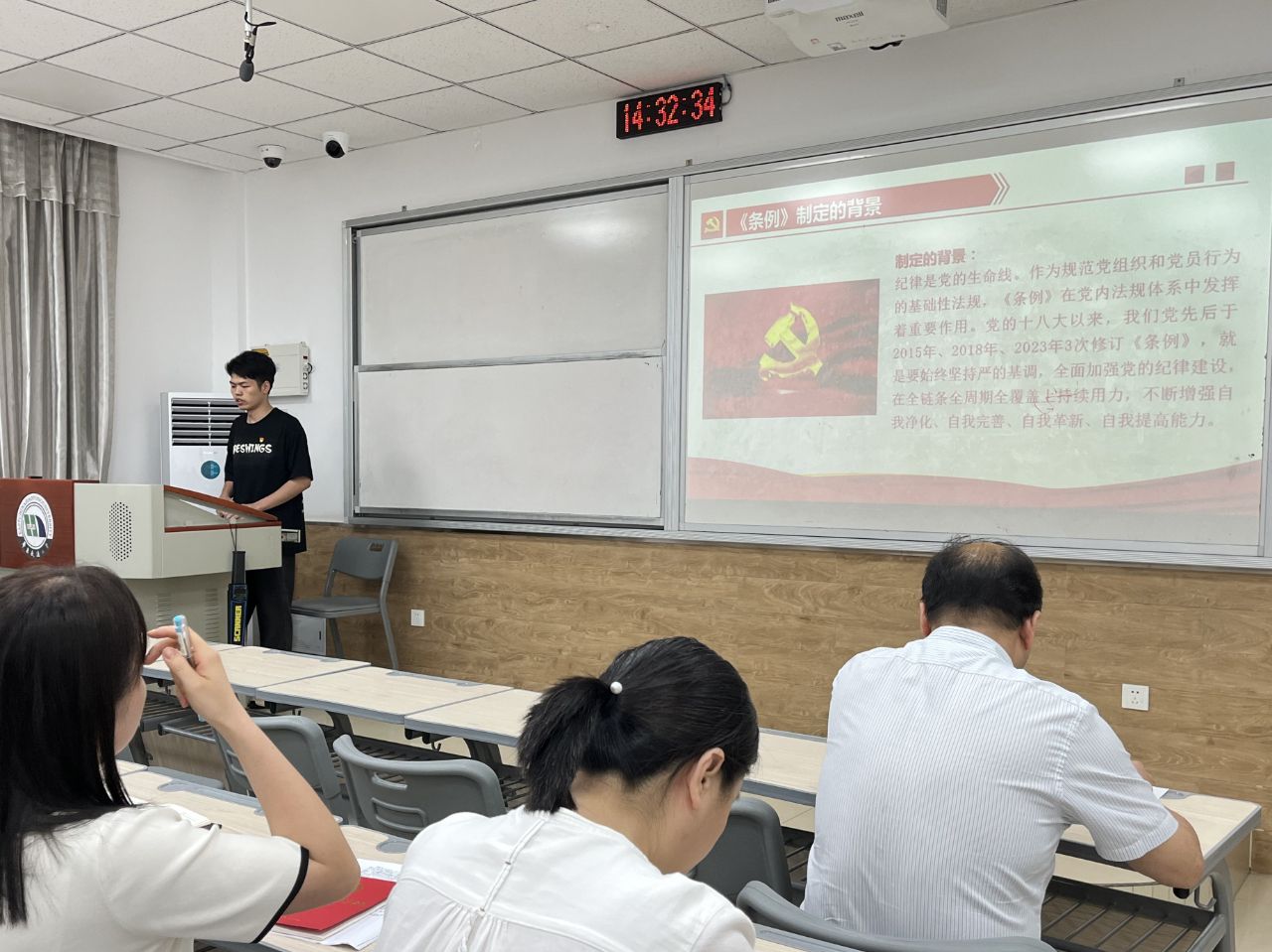 活动伊始,防灾减灾工程研究生党支部书记李超将从《条例》制定的背景、深远意义、主要内容、学习要求等几方面切入,带领党员同志进行学习。他提到维护党中央权威不仅是政治责任,也是每个党员的基本义务。在日常工作和生活中,我们应时刻警醒,确保在思想、政治、行动上始终与党中央保持高度一致,要自觉学纪、知纪、明纪、守纪,做党纪的忠实崇尚者、自觉遵守者、坚定践行者。